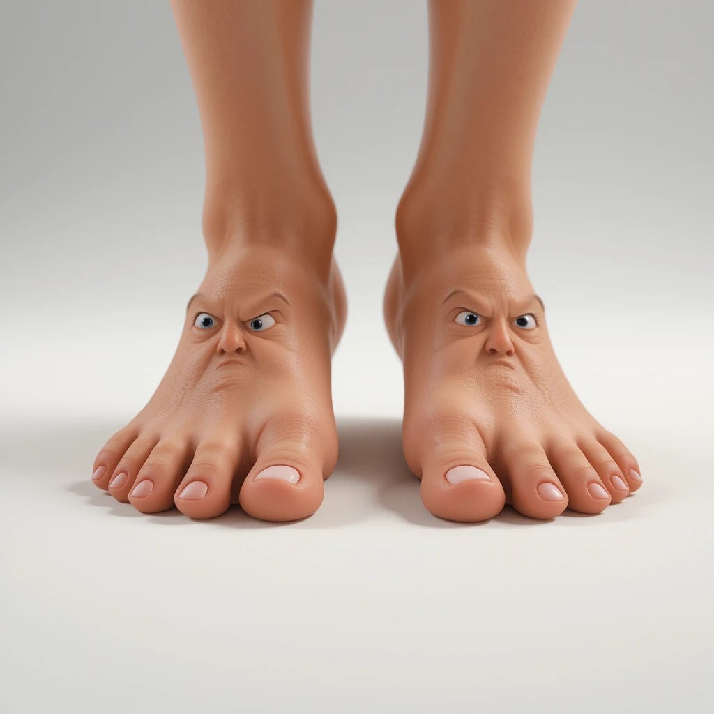 The right and left are at odds with each other. My left knee is sprained and there is chronic osteoarthritis in the right knee. The right knee blames the left for placing any xtra burden on it. The left blames the right for foolishly being attached to a slightly shorter leg. The right suggests cutting off my useless small left toe. So nasty. My toes are about to riot. A voice in my head distracts me; oh, no sorry, that’s the commander and chief’s voice bringing order to both the left and right, “And forward march. Hi ho, hi ho, it’s off to war we go. Yes stay distracted my friend.